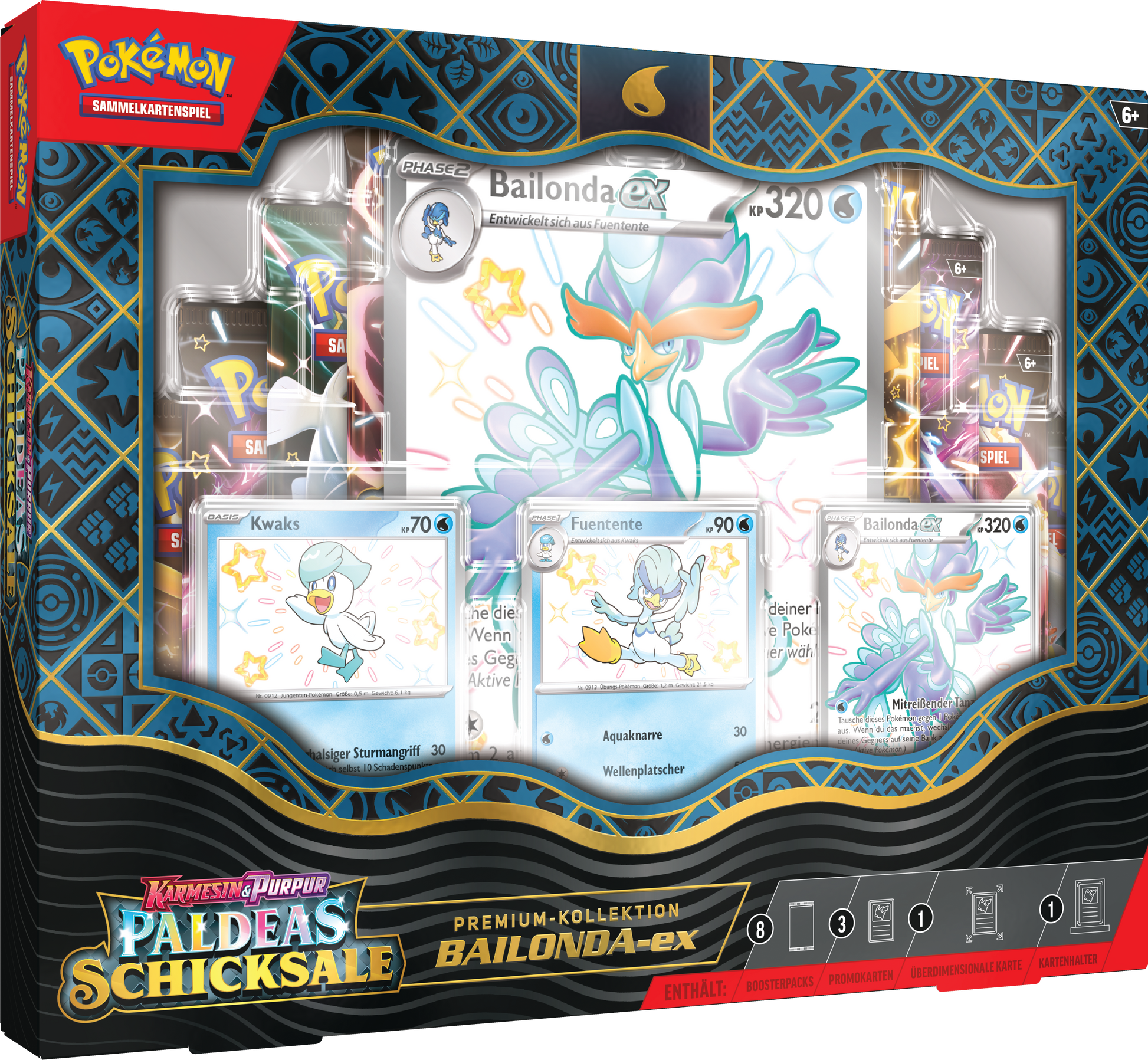 Jede Premium-Kollektion Karmesin & Purpur – Paldeas Schicksale: Pokémon-ex des Pokémon-Sammelkartenspiels enthält: