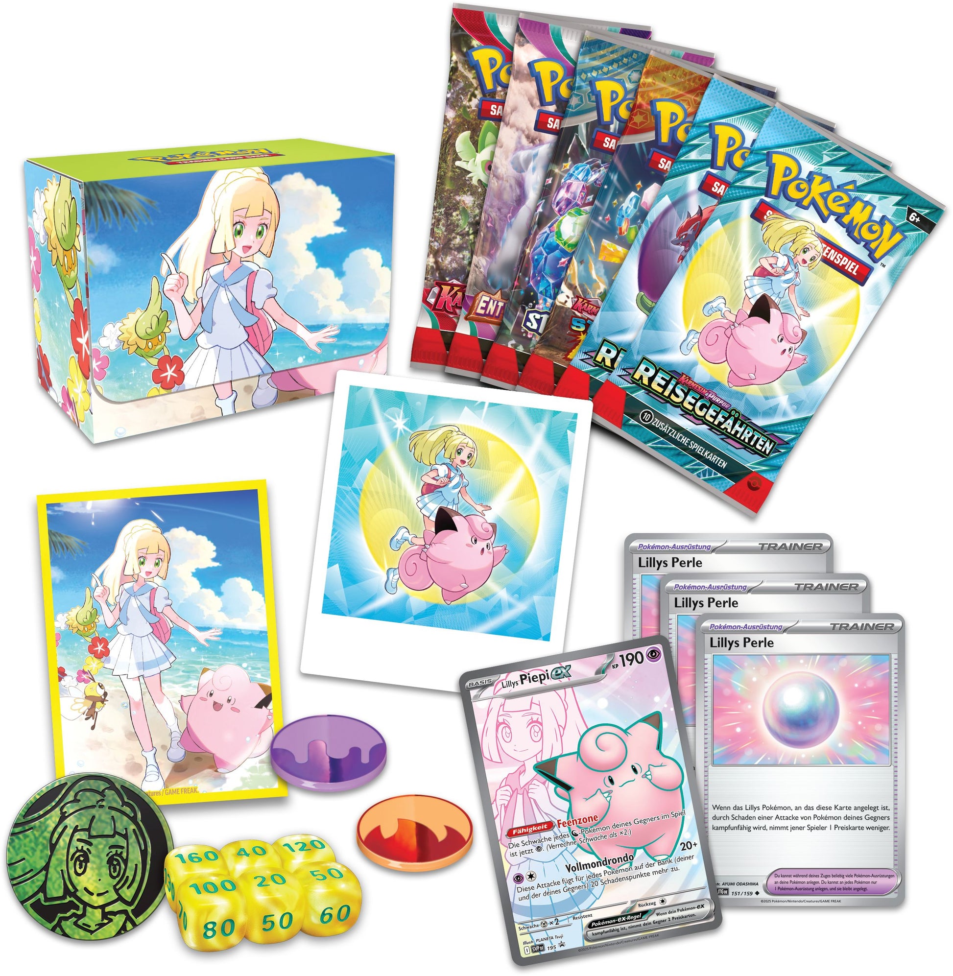 Du erhälst außerdem drei Exemplare von Lillys Perle - eine Pokémon- Ausrüstung, die Lillys Pokémon unterstützt - sowie Boosterpacks, einen Sticker, illustrierte Kartenhüllen, eine Deckbox und weiteres Zubehör für das Pokémon-Sammelkartenspiel.
